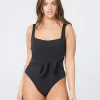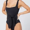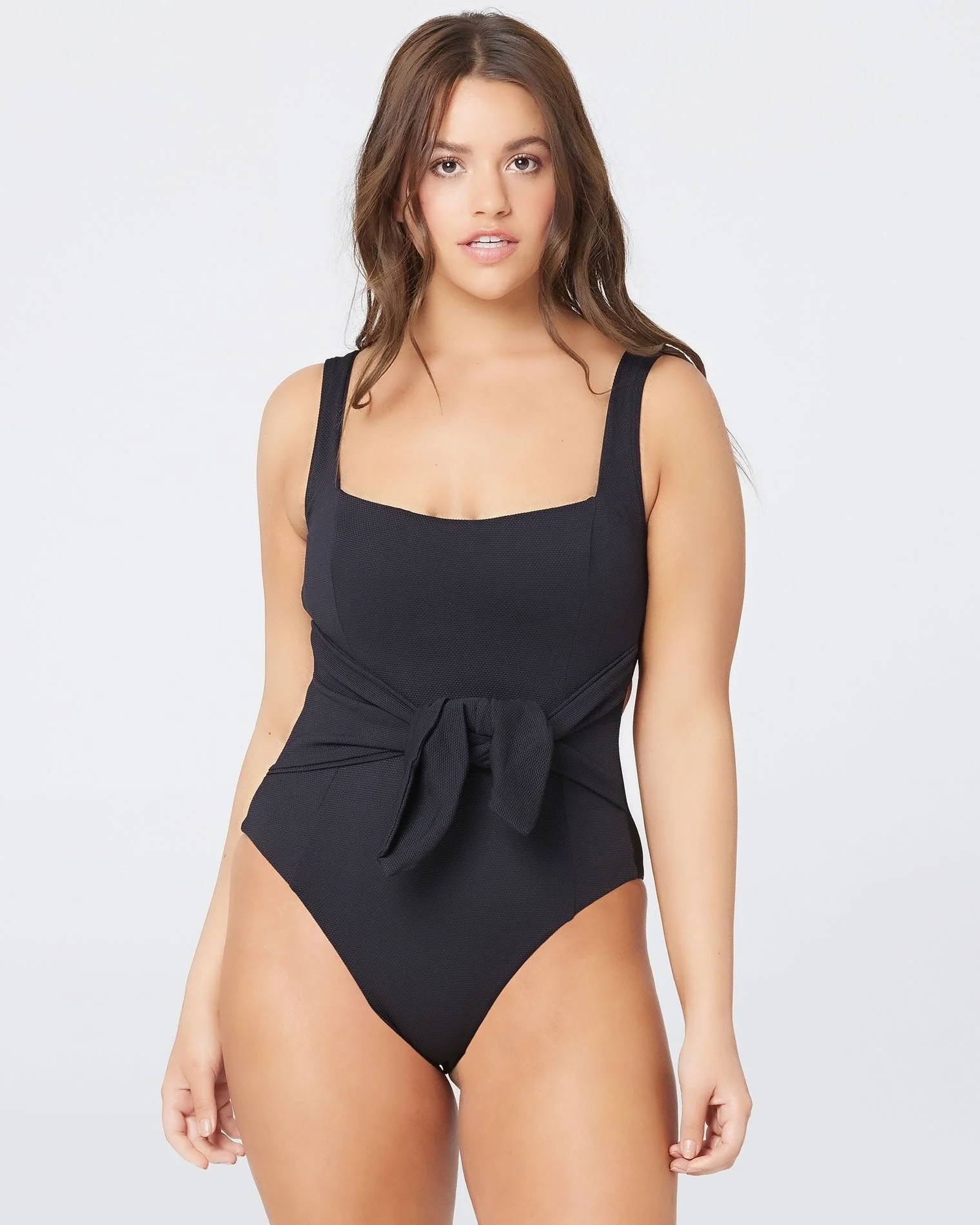 The Balboa One Piece is a vacation essential. Crafted from soft pique fabric, it features an adjustable waist tie, flattering front princess seams, and back cut out. Adjustable 3-point back and straps lets you customize your fit.Pique fabric one piece Square neck Built-in padded bra Large accent adjustable waist tie Princess seams in front Adjustable 3 point back with back cut out Classic coverage Size XS-XL 91% nylon, 9% spandex Like all delicates, shape, color and fit are best preserved if hand washed in cold water. Lay flat to dry. Style # PPBAMC222