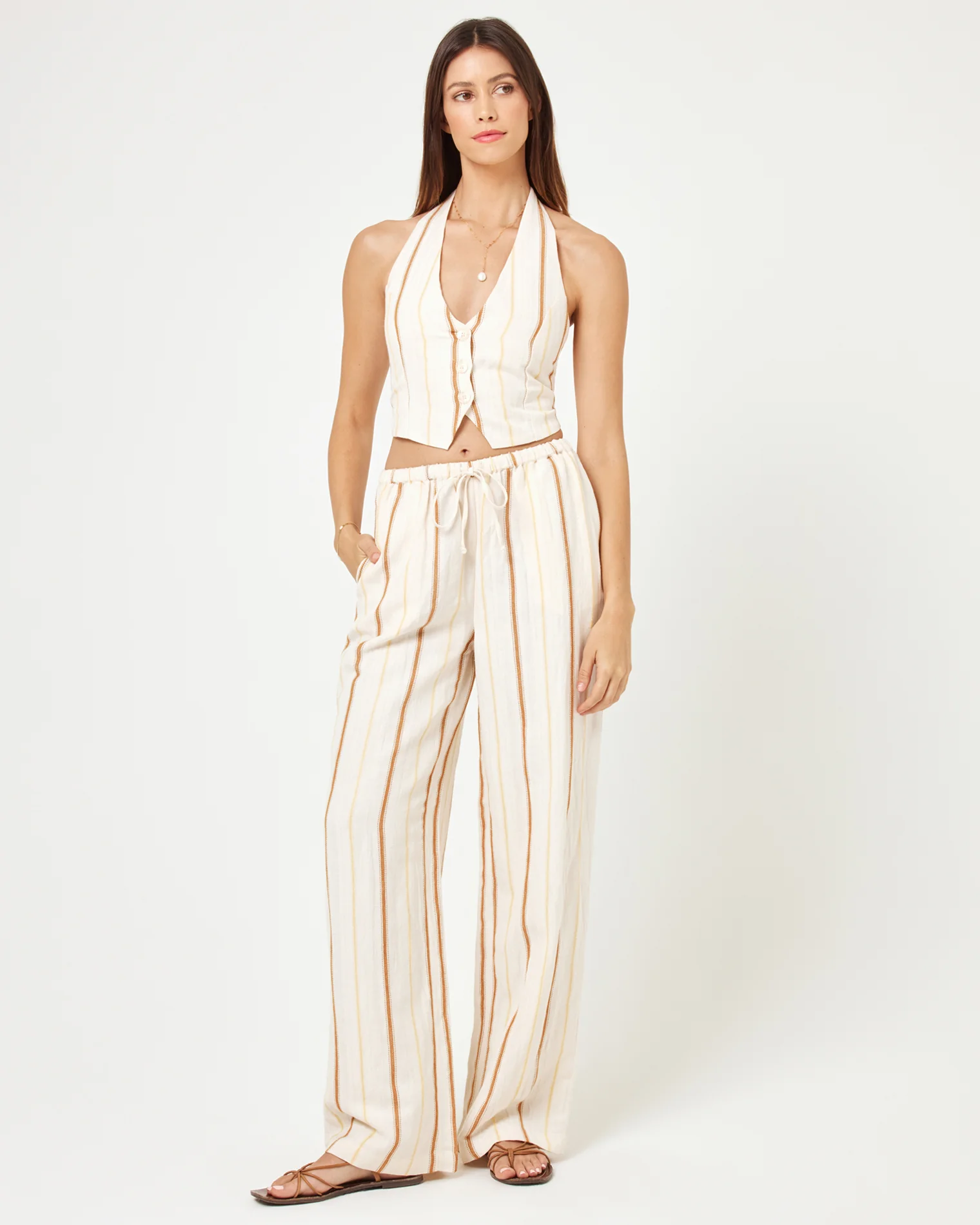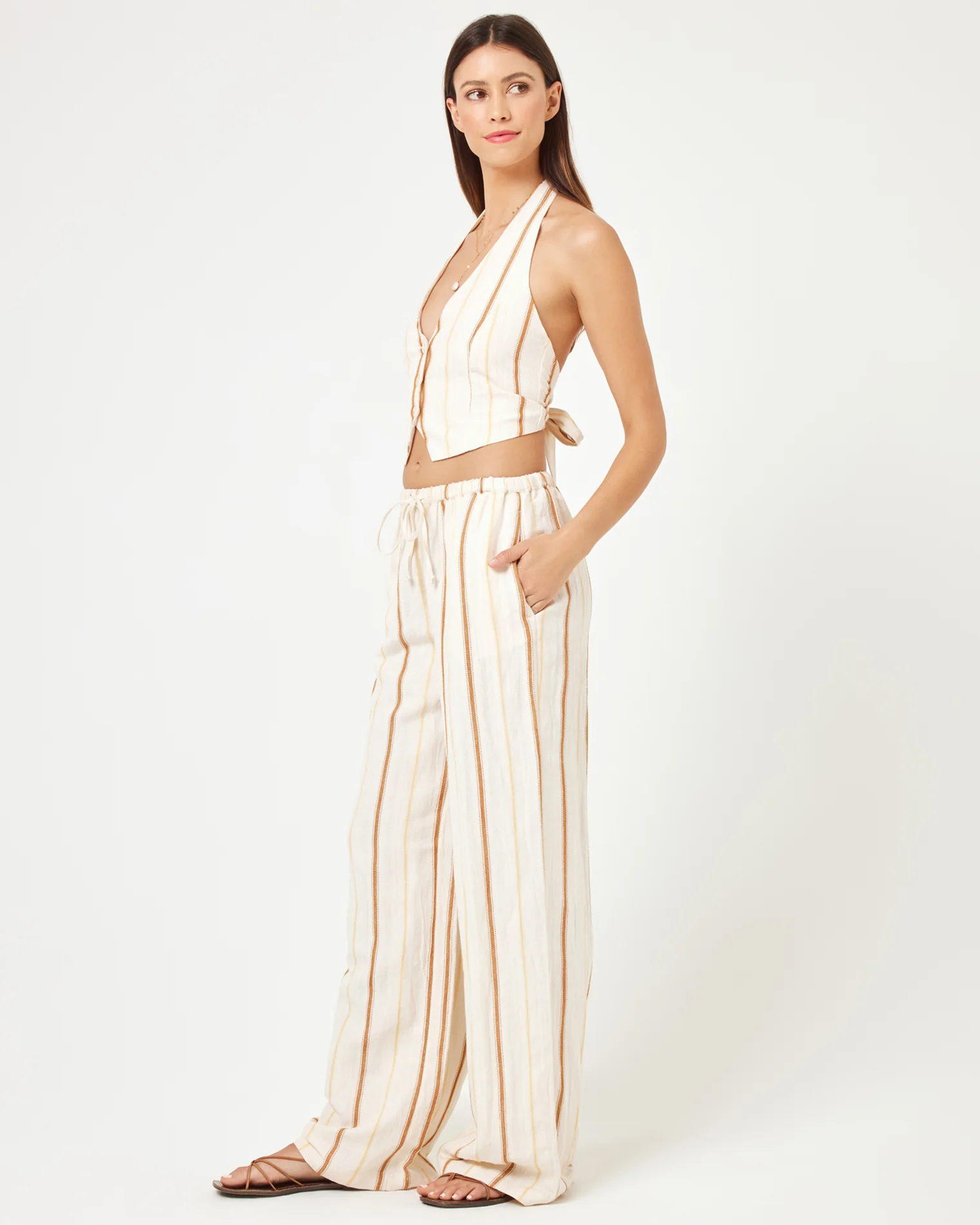 From the boardwalk to brunch, the Beach House Pants are serving up a laid back but polished look. These wide leg, drawstring pants are made from our striped linen fabric and look polished as a set when paired with the matching menswear-inspired vest. Drawstring Waist Wide Leg Pant Pocket At Hip Linen Viscose XS-XL 55% Linen 45% Viscose Style # BCHPA24