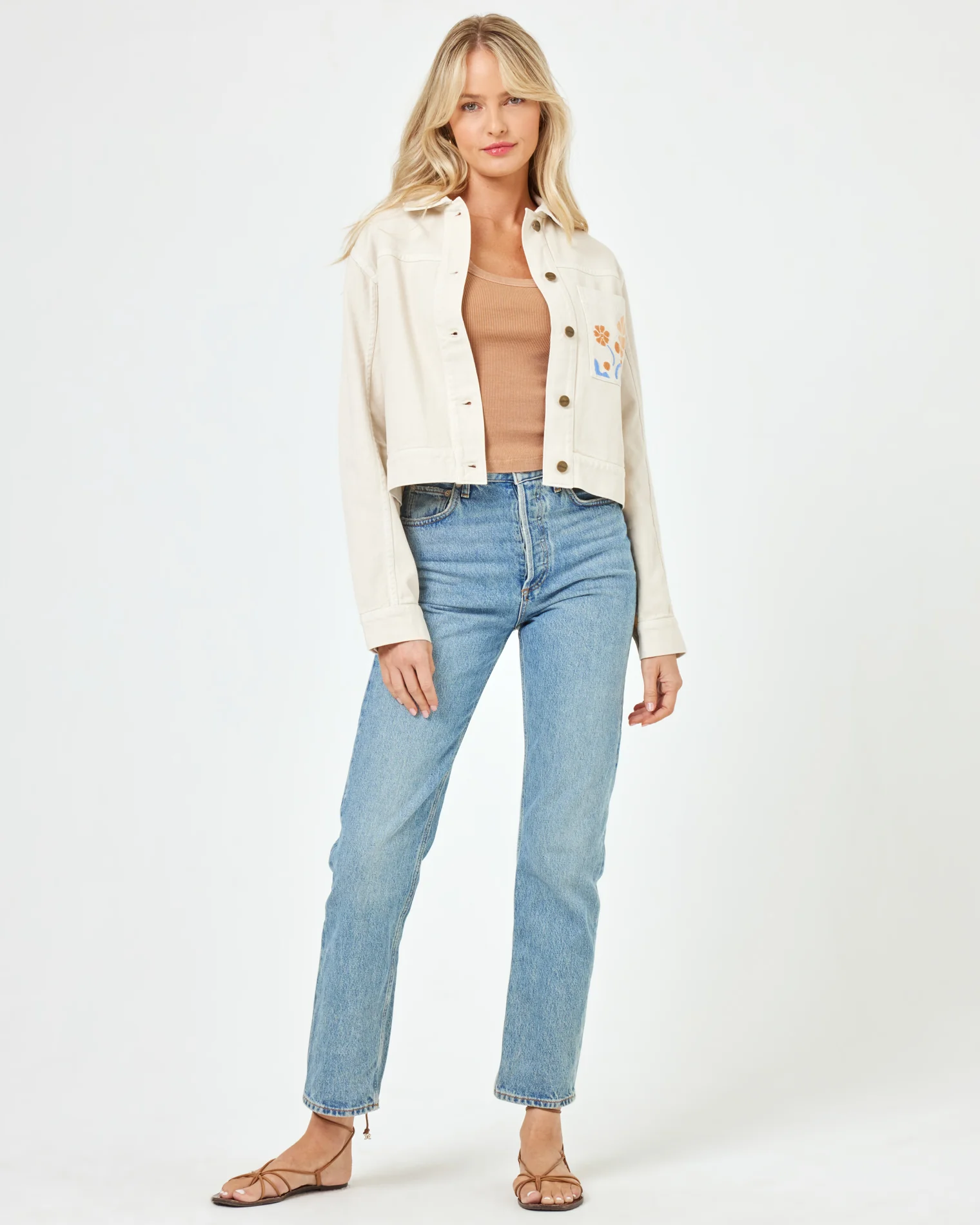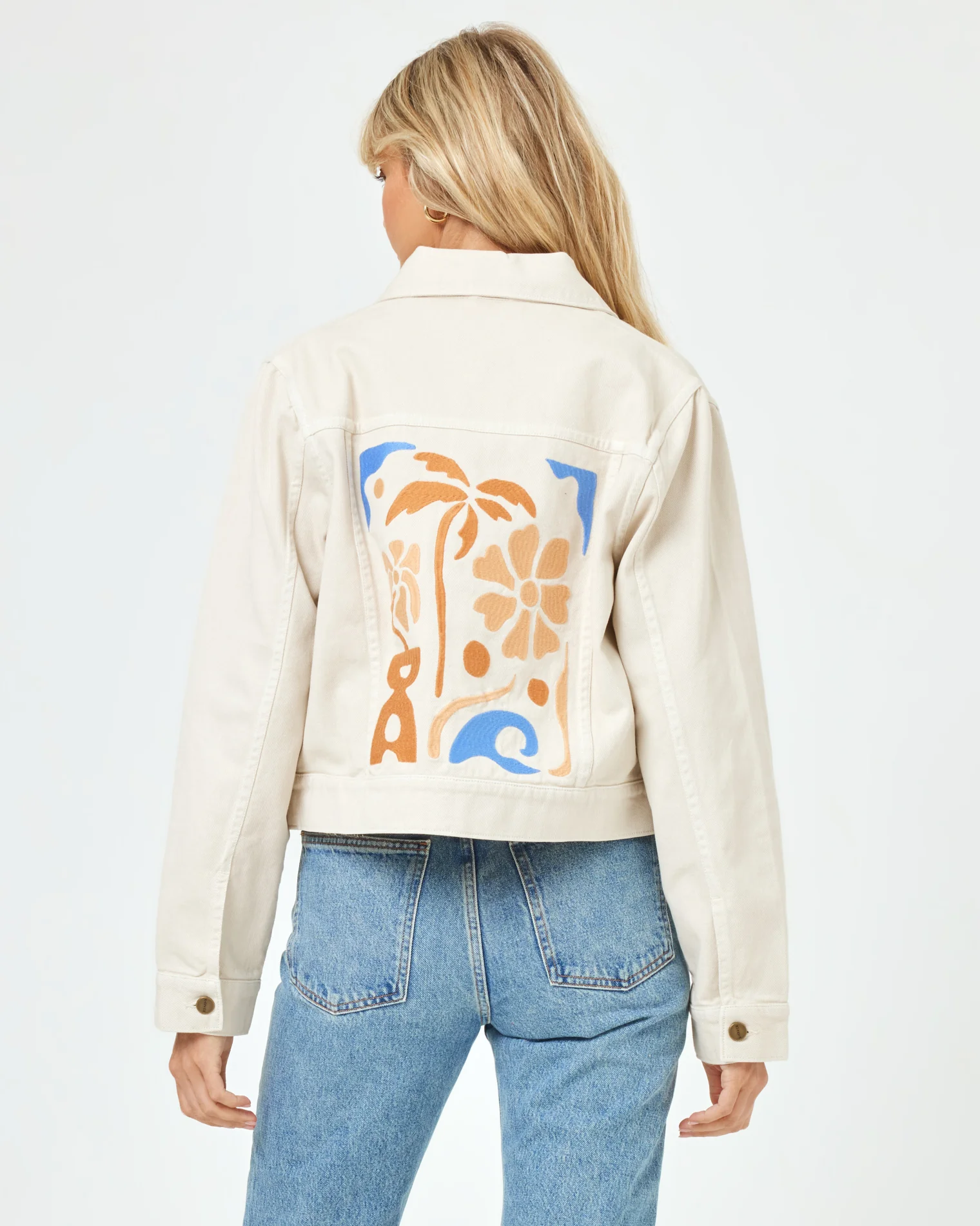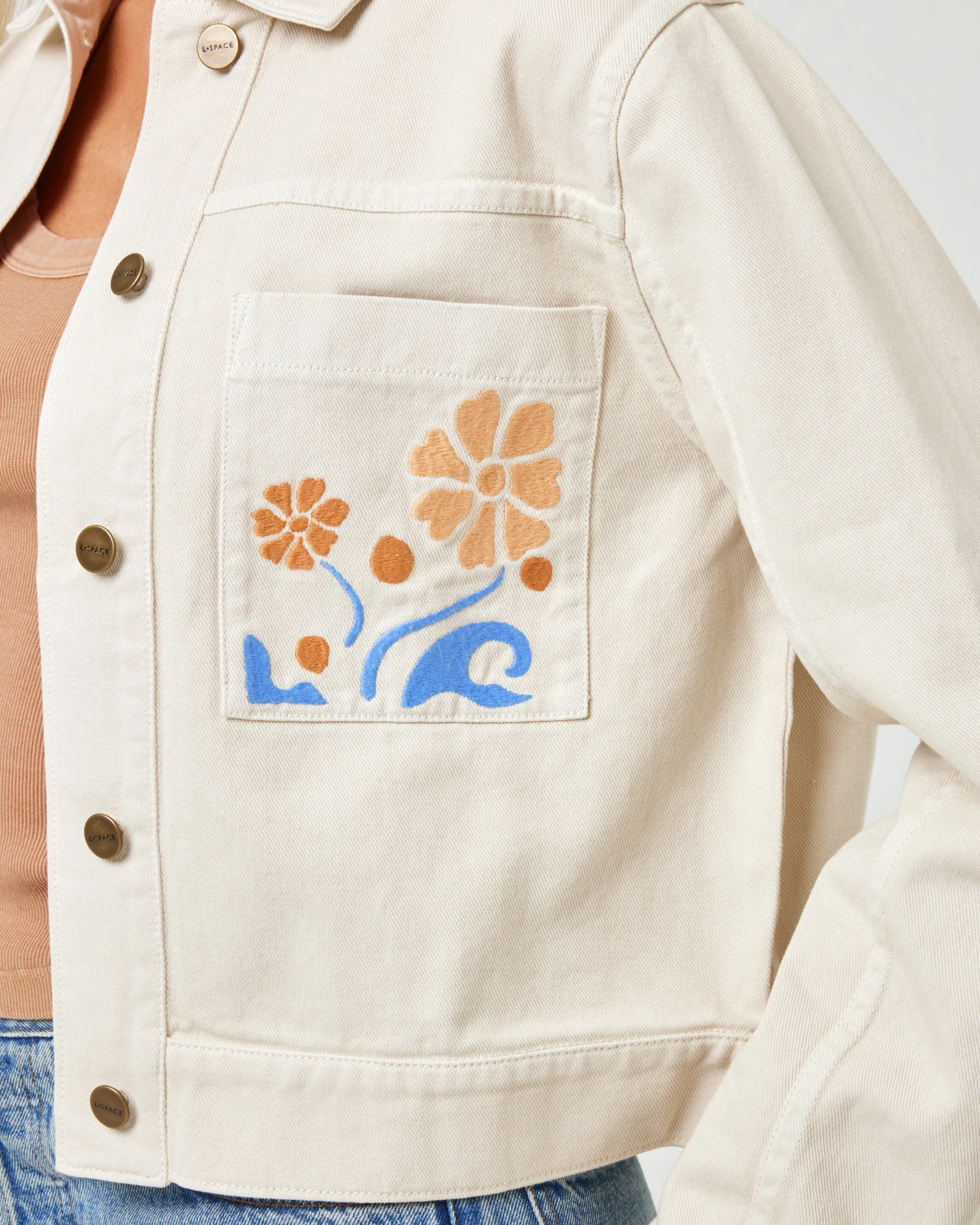 The cotton denim Capri Jacket is the perfect layering piece. Its cropped silhouette, LSPACE logo buttons, and detailed embroidery on the back and front pocket make this jacket a special piece for your closet. Wear it with a ribbed dress or your favorite pair of denim. Cropped Jacket Cotton Denim Button Down L Space Logo Buttons Buttons at Wrist Cuff Breast Pocket Embroidery Back Embroidery Size XS-XL 100% Cotton Like all delicates, shape, color and fit are best preserved if hand washed in cold water. Lay flat to dry. Style # CAPJA24 Model Measurements: Lura, size S – Height 5’9, Bust 32″, Waist 24″, Hips 34″